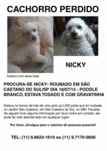 PROCURA-SE NICKY - ROUBADO EM SÃO CAETANO DO SUL/SP – em 18/07/13- Poodle branco, estava tosado e com gravatinha.\nEstava no banco de trás de uma pick-up L200 preta que foi roubada no Jardim São Caetano, em São Caetano do Sul, no ABC Paulista, se alguém tiver alguma informação por favor entre em contato, ele pode ter sido abandonado em qualquer lugar !!\n\nGENTE POR FAVOR!! divulgue para o máximo de pessoas possível, tel para contato (11) Cel: 966231610 e 991700606