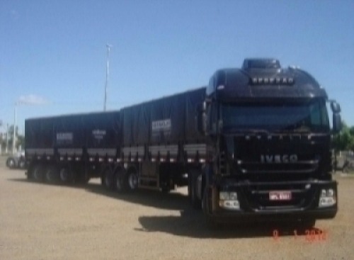 Bitrem 9 eixos, de cor preta, com a inscrição BEBEZÃO no luminoso dianteiro e SERAGLIO nas laterais das lonas dos semi-reboques, da marca Guerra.