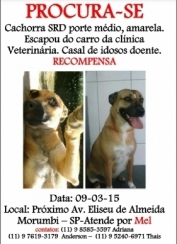 SRD, amarela, aproximadamente 8 anos, atende pelo nome de Mel, fugiu do PetShop no dia 09/03/2015 por volta das 17horas. A última vez que foi vista estava na Av. Elizeu de Almeira próximo ao Shopping Butantã.