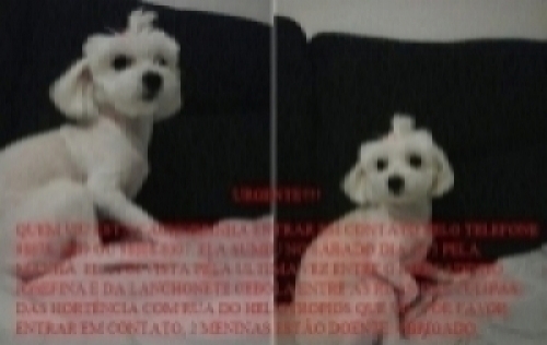 ***ENCONTRADA***\nEssa é minha cachorrinha, maltes com puldo cor Branca, pelo ralo ( por que foi tosada)muito dócil, tem 6 anos esta com família deis que nasceu... sumiu no sábado dia 10/5 pela manhã volta das 10 hs no bairro Jardim Motorama zona leste de SJCampos - foi vista proxima mercadinho Josefina e Lanchonete Cebola- 2 crianças uma de 01 ano e outra 4 anos estão doente e sentindo muita falta.... Ajude !!!!\nPS: ela está com um lacinho rosa na cabeça ( conforme a foto- foi tirado um dia anterior )\nPor favor, se alguém achou ou tem alguma informação, entre em contato através do site. Obrigado
