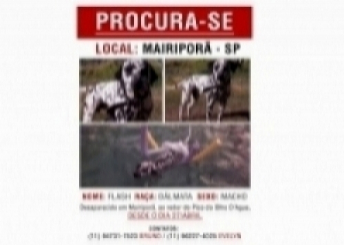 Nosso cão (dálmata) sumiu no domingo 27/04/14 e estamos extremamente tristes com seu sumiço. \n\nEle ficava no sitio em Mairiporã (Estrada do Mato Dentro em Mairiporã) e achamos que alguém que foi visitar algum sitio na redondeza deva ter levado, já que ele adorava sair para dar uma voltinha.\n\nEstamos desesperados atrás dele, já colocamos cartazes pela redondeza mas sem nenhum sucesso.